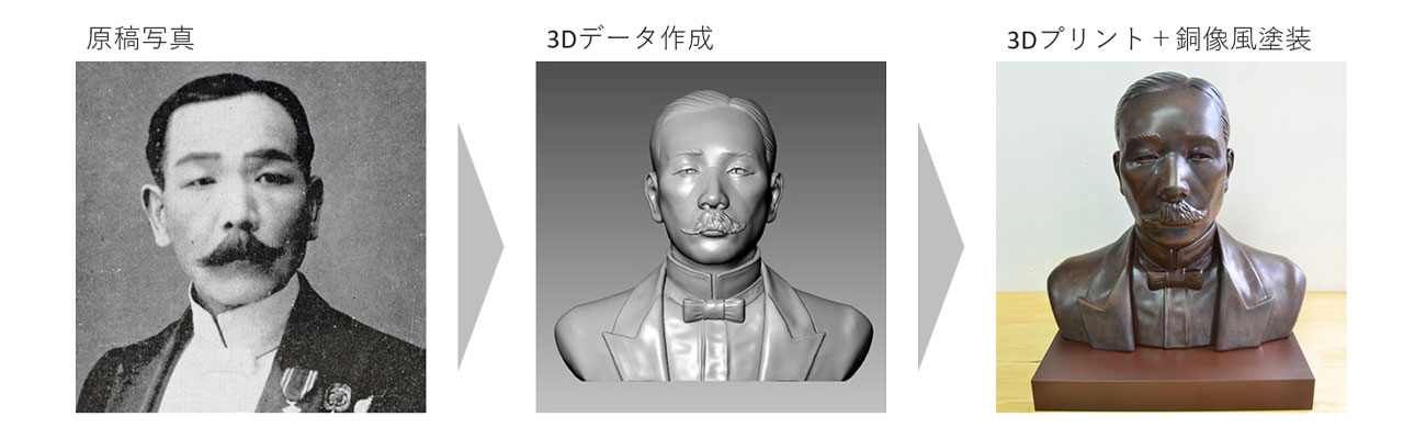 普通の銅像を製作するのは大変です。まずは原型師と呼ばれる職人が、原型を粘土等で作ります。その後、銅像を鋳造するための砂型を作成します。その砂型に、熱して液体状態にした銅を流し込んで、そのまま冷やします。銅が固まったら砂型から取り出して、表面を磨きます。さらにいわゆる銅像の風合いを出すために最終仕上げを行います。どれも非常に大変な作業です。しかし、ロイスエンタテインメントは、3Dソフトで原型となる3Dデータを作成し、そのまま3Dプリンターで造形し、塗装します。こうした最新の工程によって大幅なコスト削減が可能になっています。